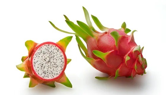 Red dragonfruit shares its recognisable exotic looks with its yellow counterpart. These cactus fruits are surrounded by green scaly spikes that are curved around the fruit. Although its name is officially red pitahaya, the colour is actually pinkish red. Depending on the variety, the fruits contain white or red flesh, with a slightly sweet accent. Inside, the numerous black seeds stand out. They are edible.