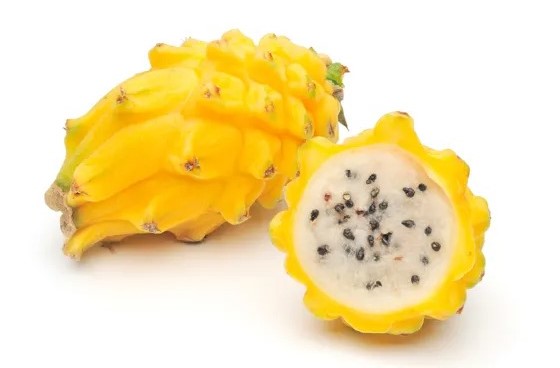 Pitahaya also exists in red and pink varieties. The yellow version is slightly smaller, but its taste is slightly sweeter than the other varieties. The white, juicy flesh contains many small black seeds that are edible.